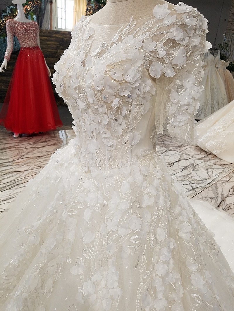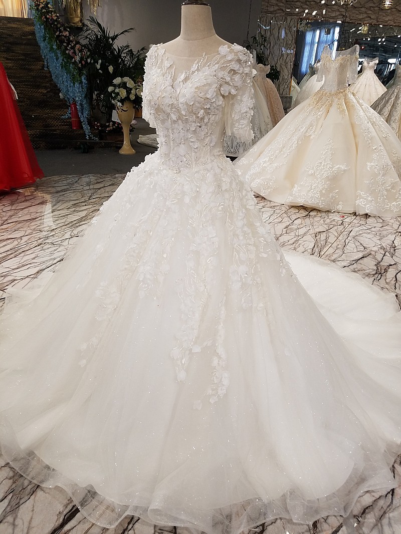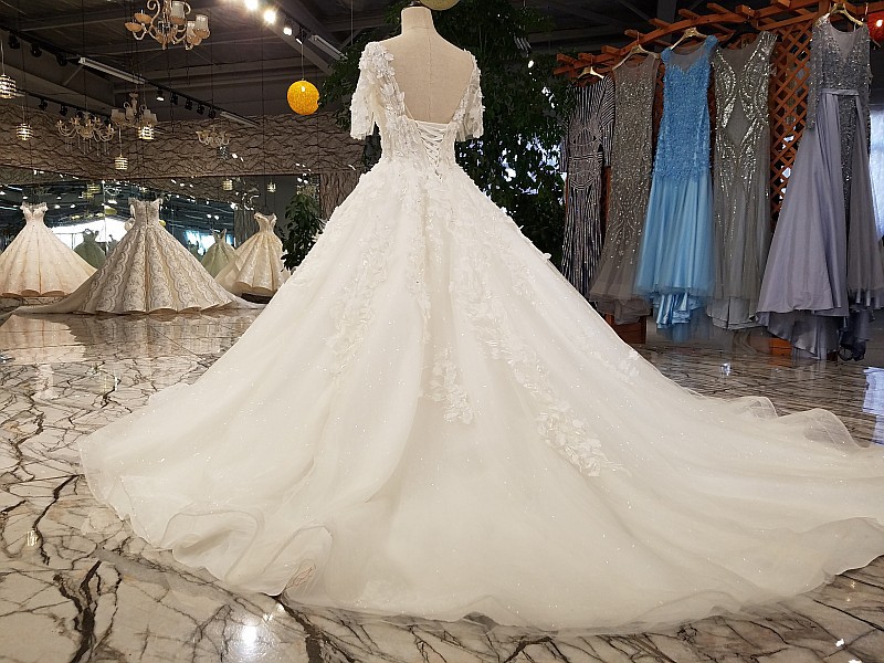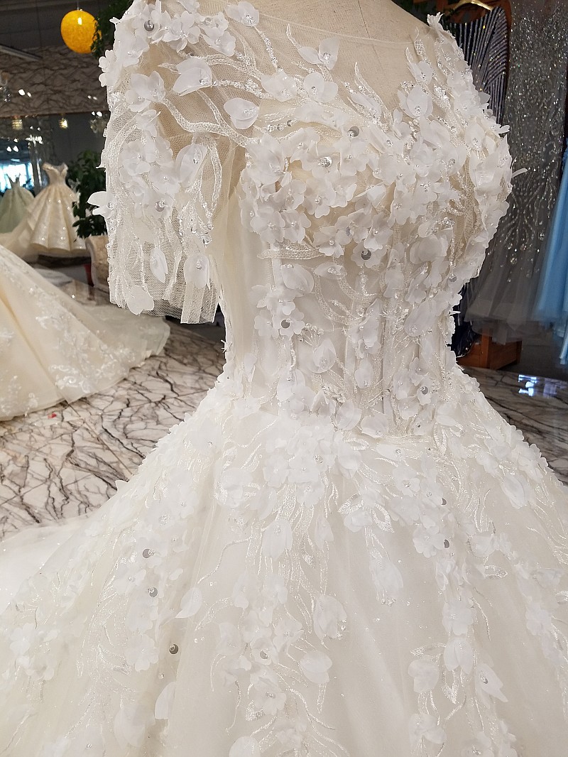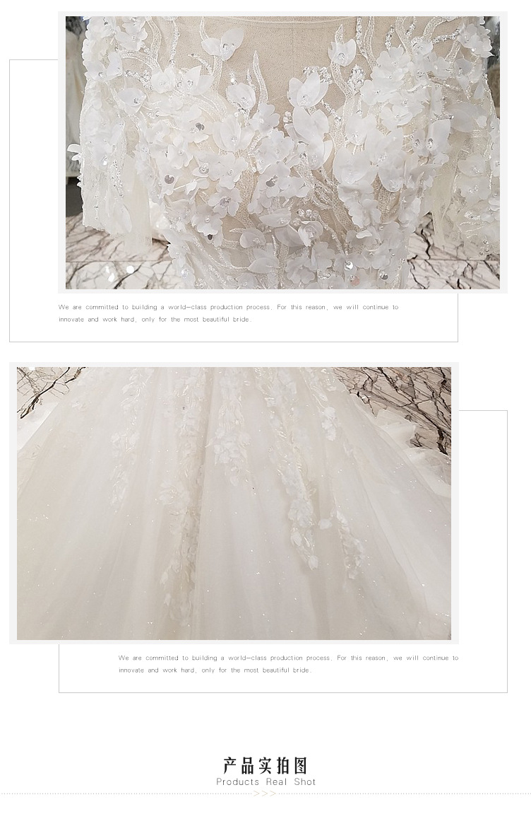 LS52098 Suzhou white wedding dress petal round neck short sleeve one meter trailing wedding dress source factory
