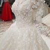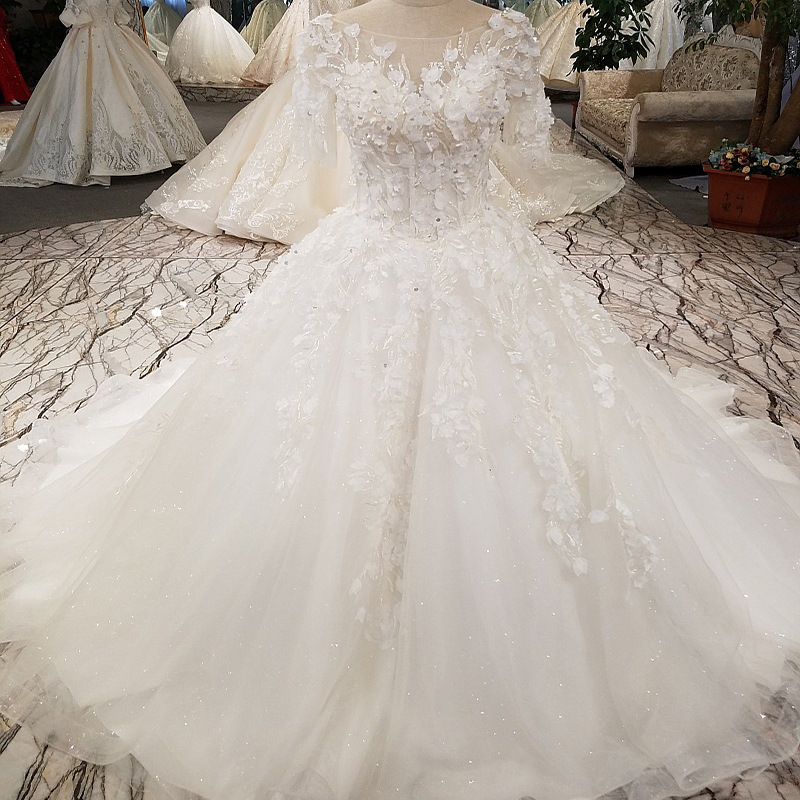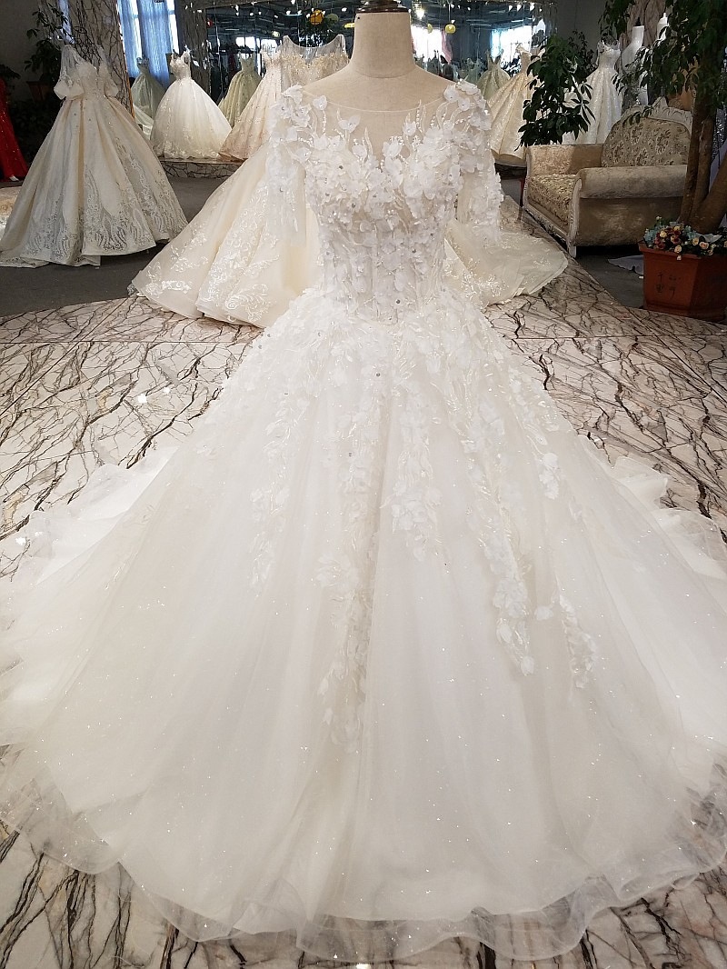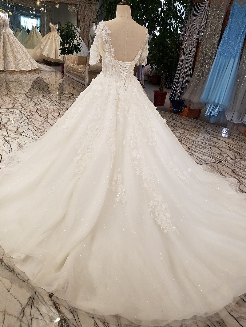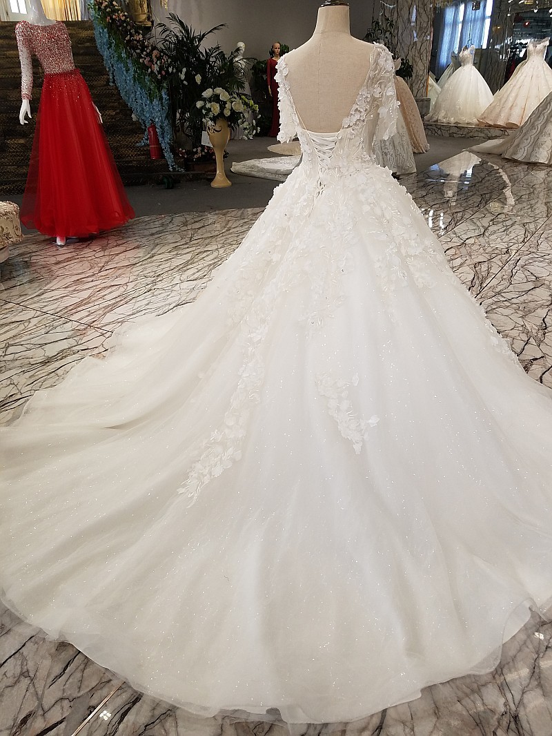 LS52098 Suzhou white wedding dress petal round neck short sleeve one meter trailing wedding dress source factory