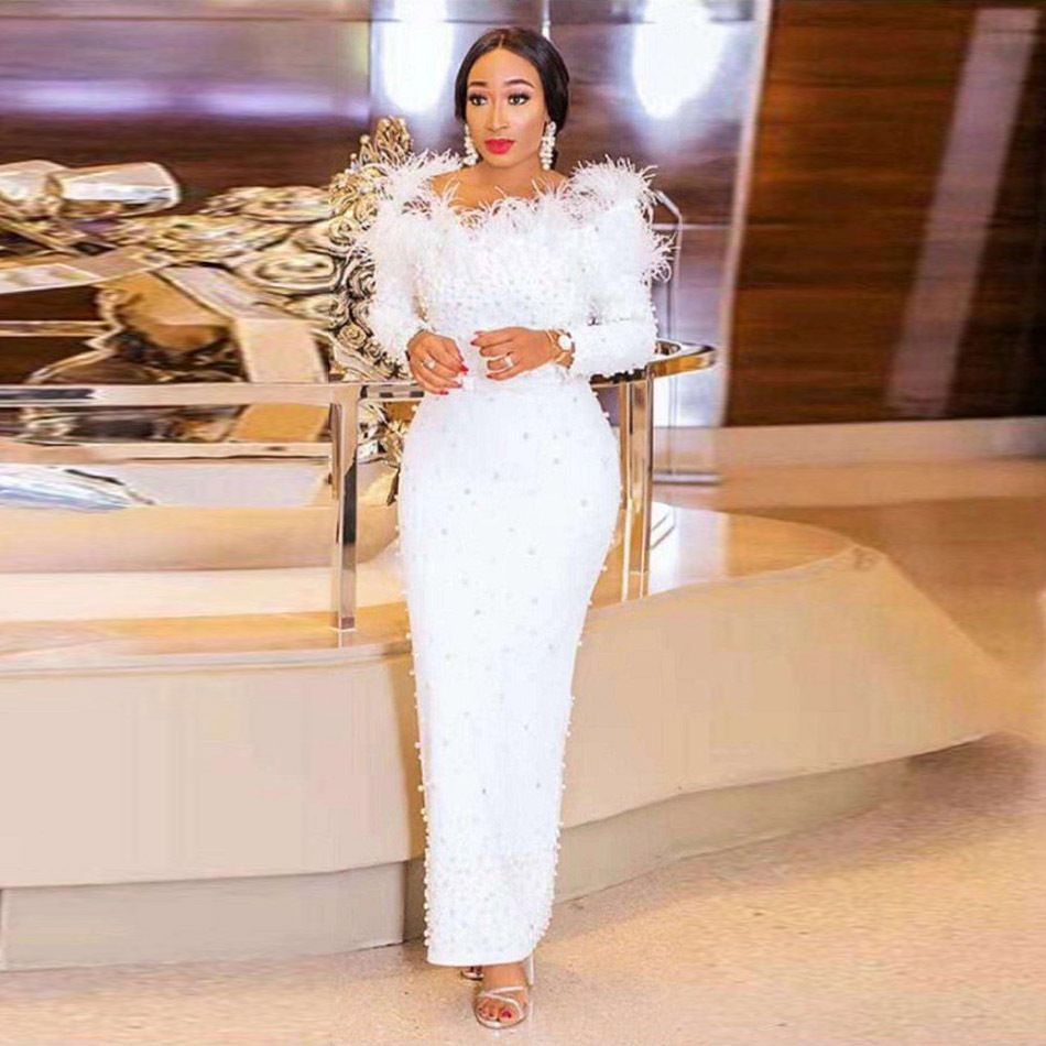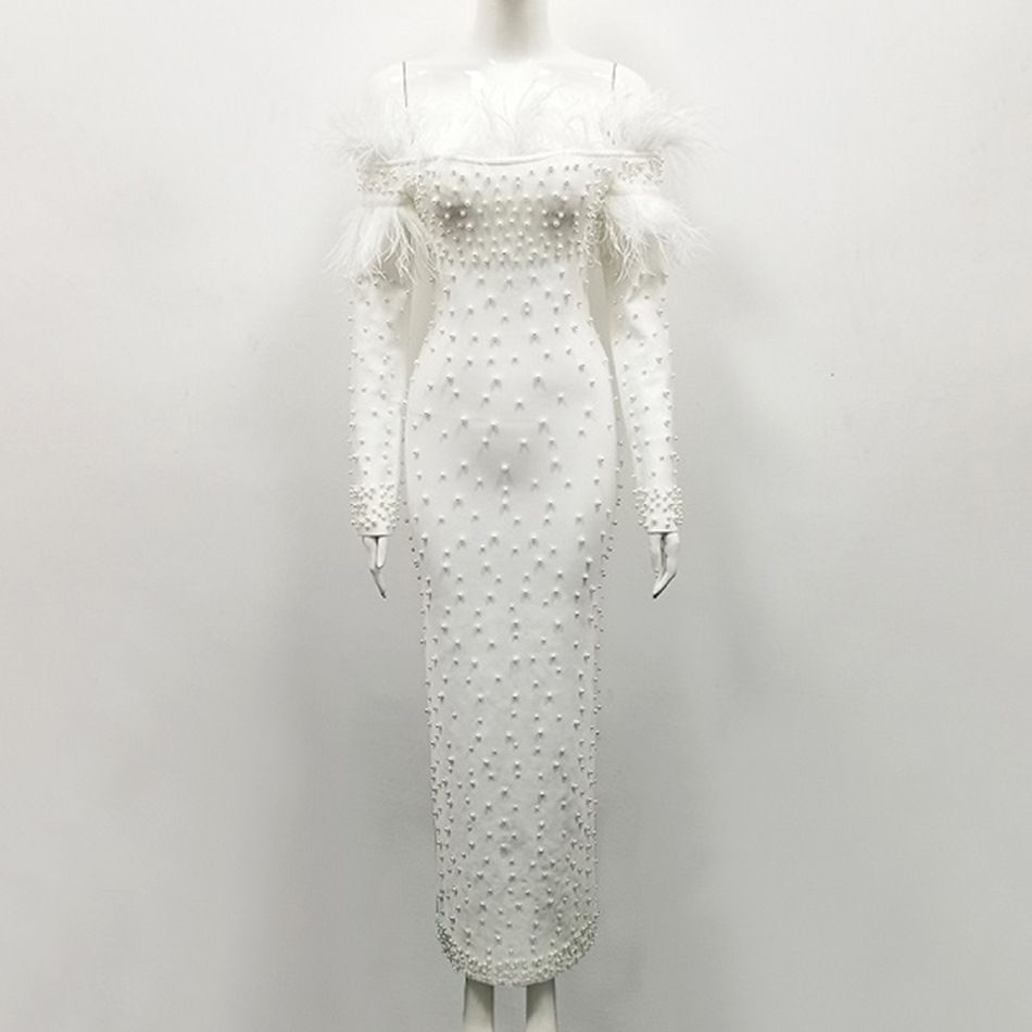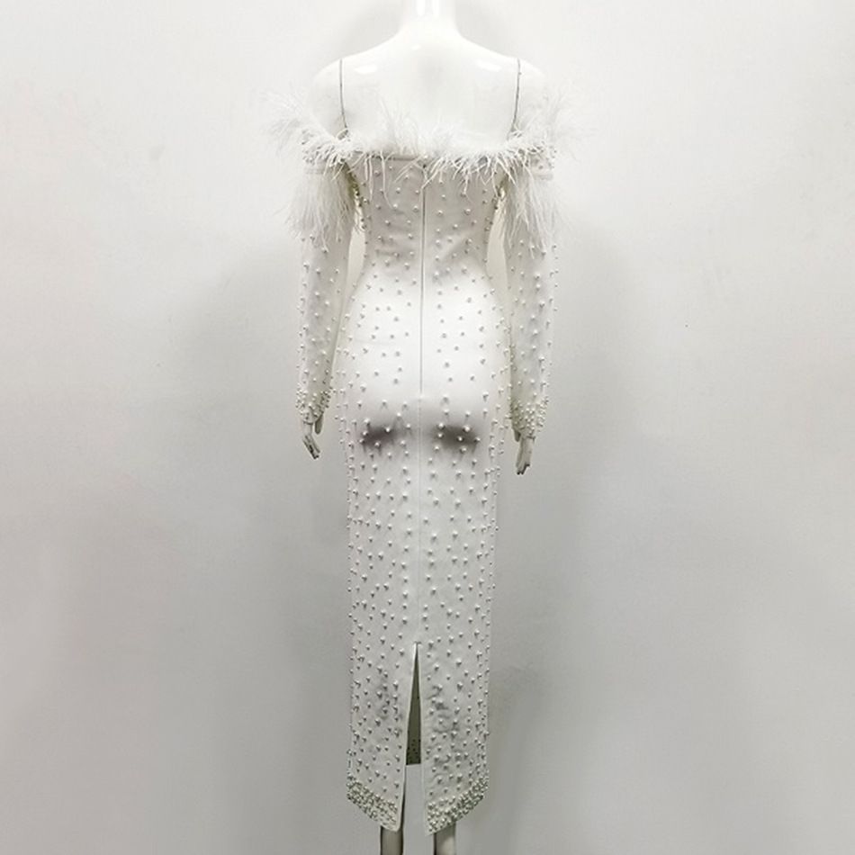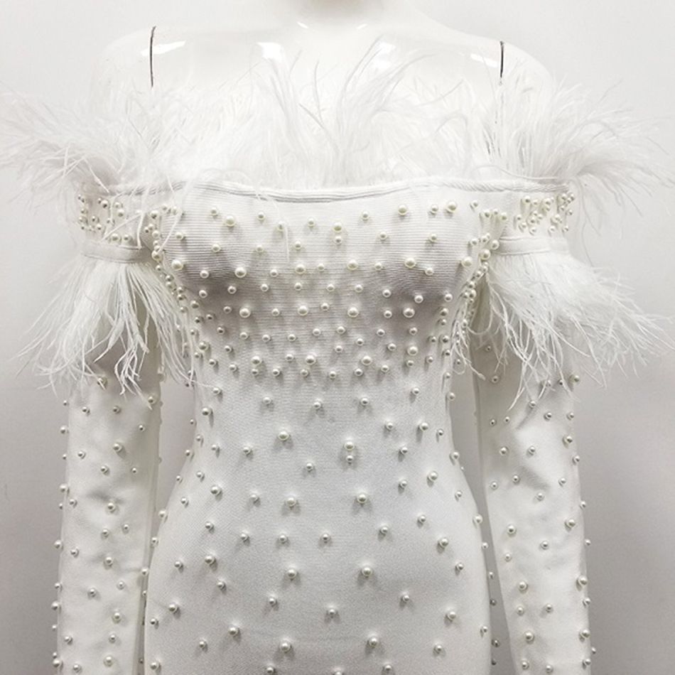 long-sleeved one-shoulder neckline feather bandage dress tight-fitting beaded white evening dress long