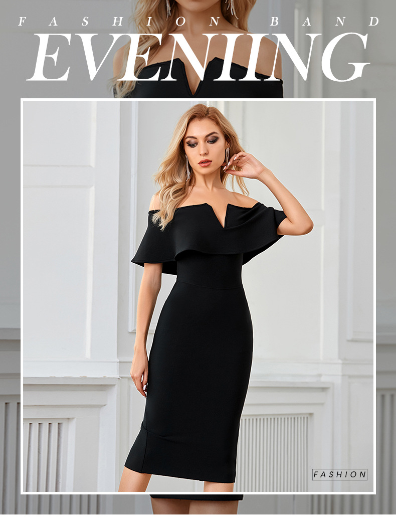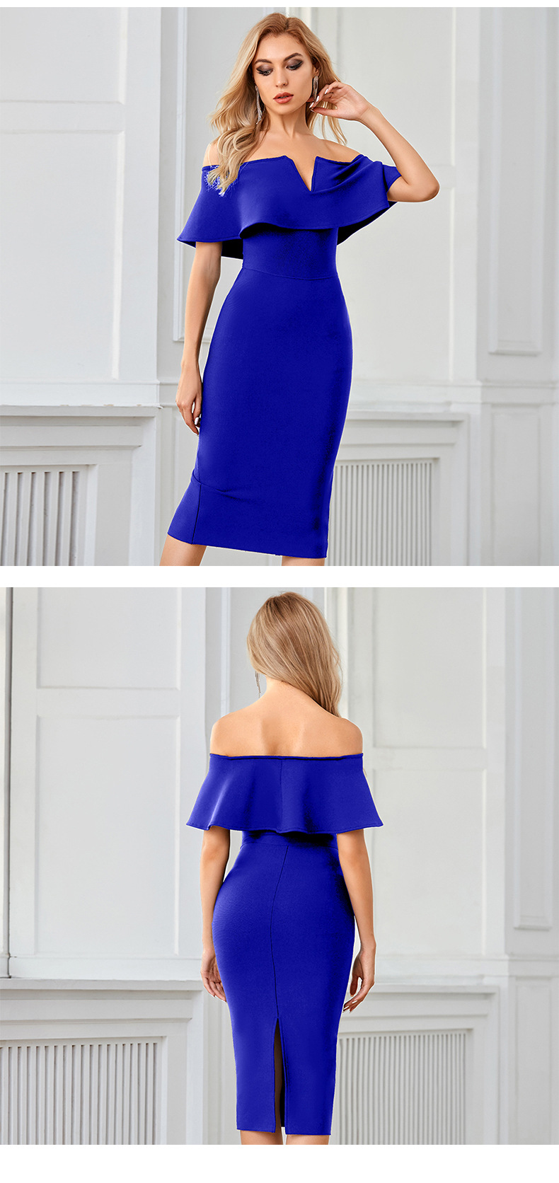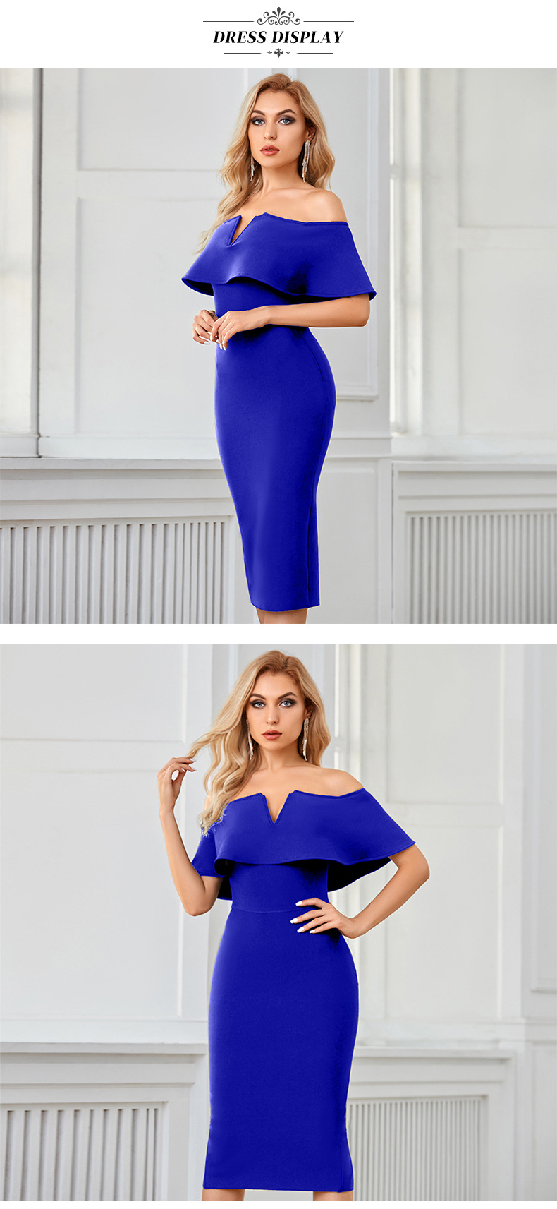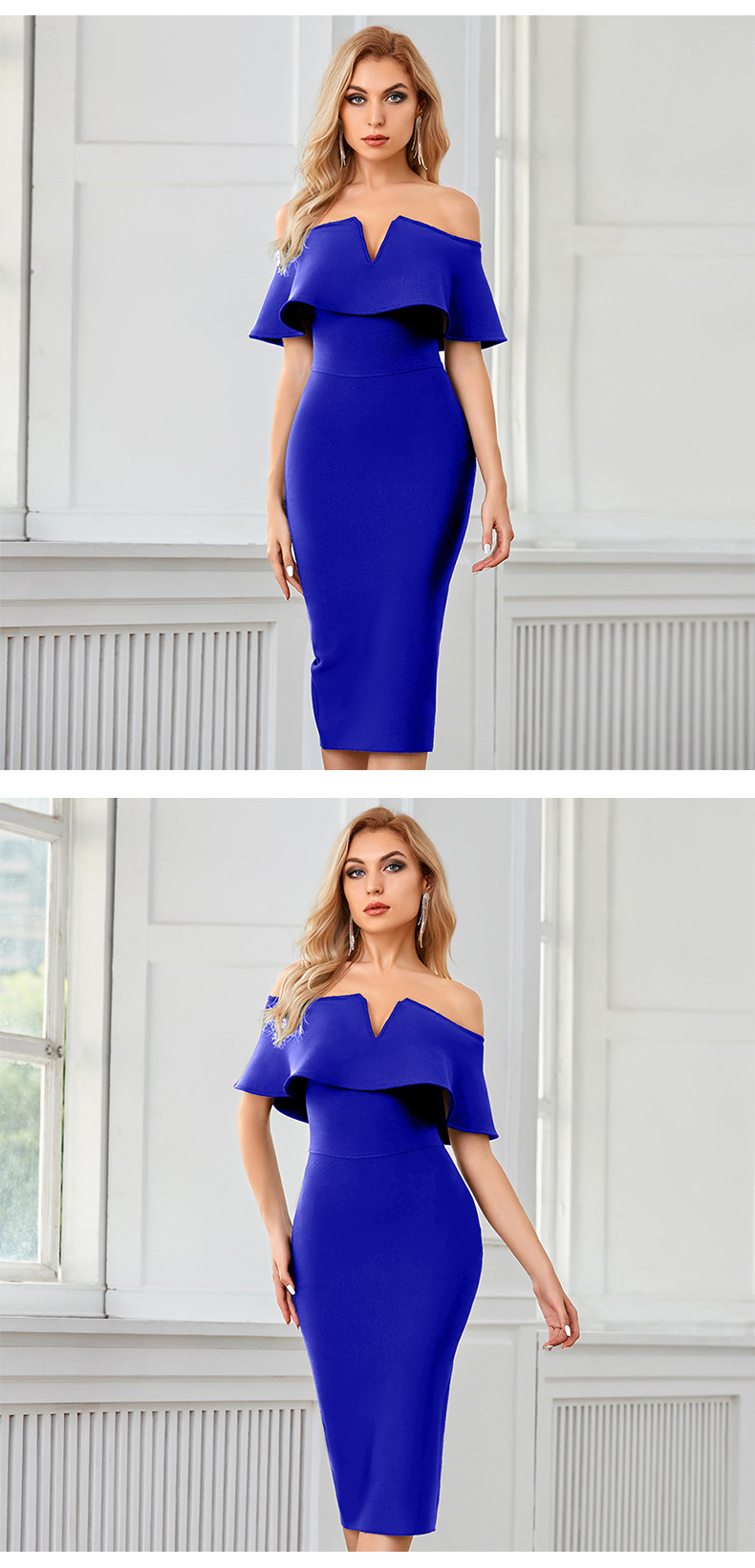 New style small V-neck solid color blue one-shoulder bandage dress elegant annual meeting host evening dress