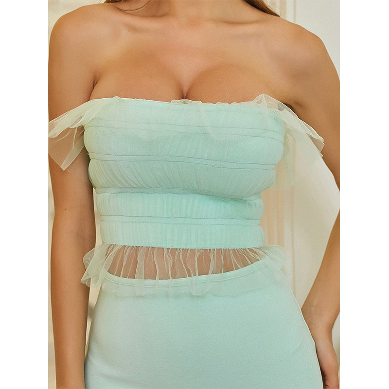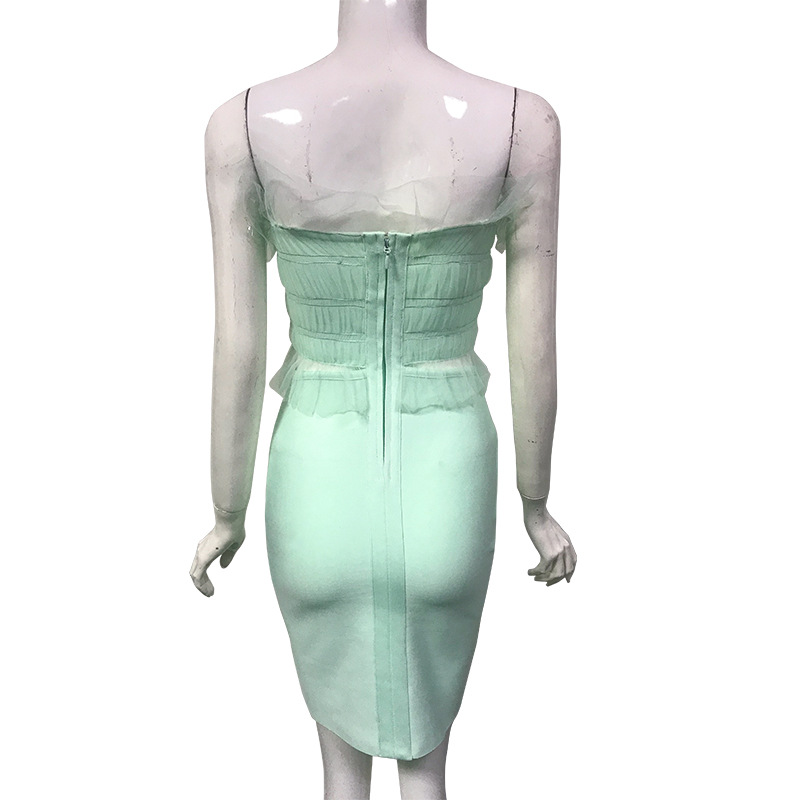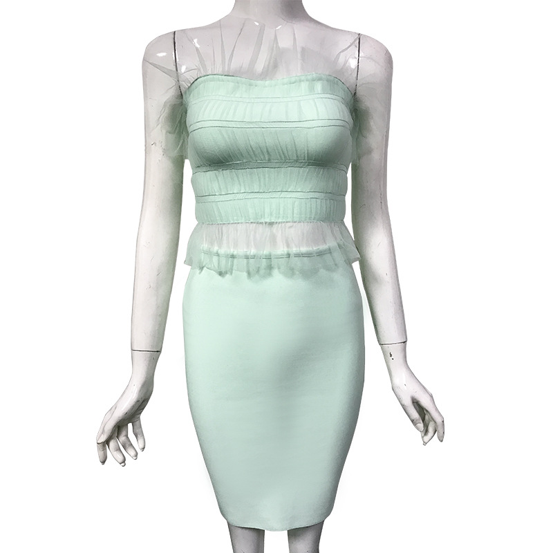 One piece of hair replacement mesh stitching dress, fake two-piece bandage skirt, wrapped chest and waist, ladies banquet evening dress