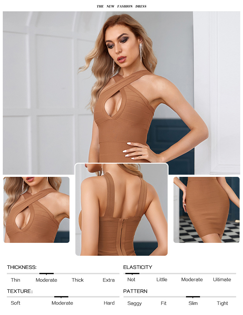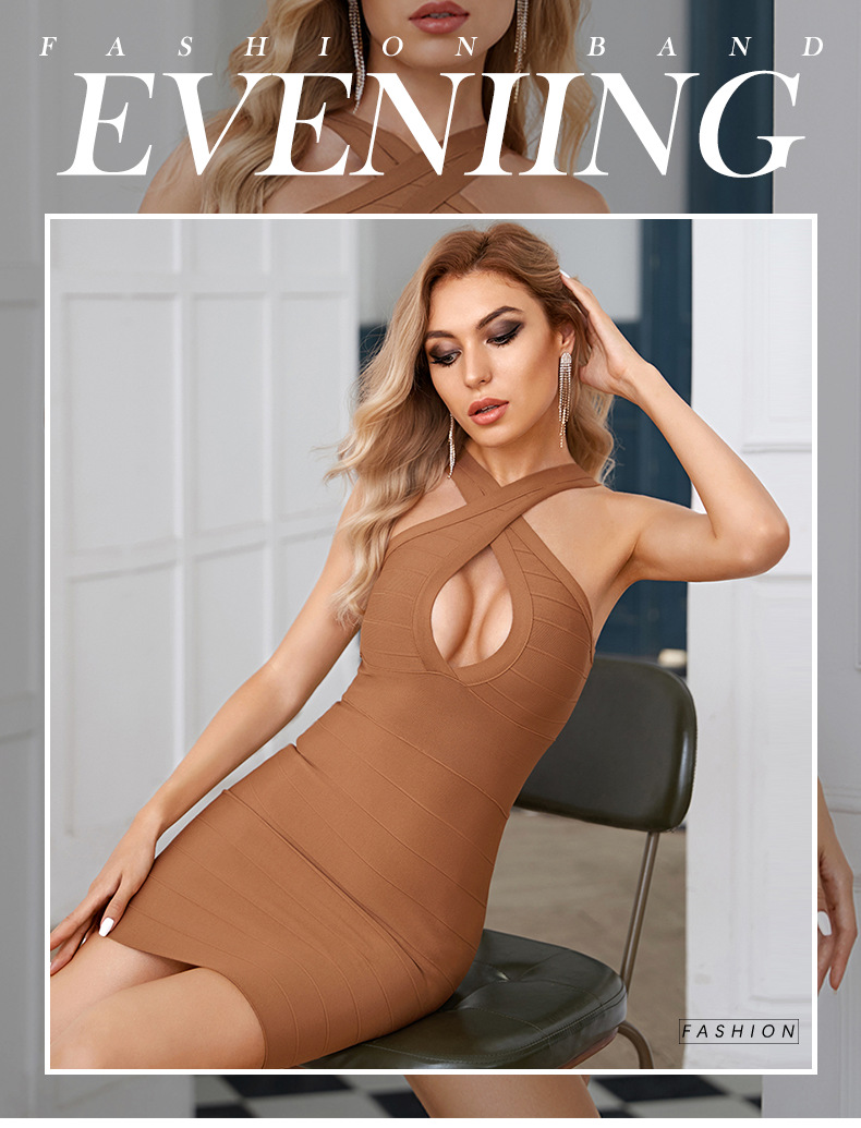 Spring brown solid color hanging neck dress with hollow chest sexy bandage dress prom annual meeting evening dress