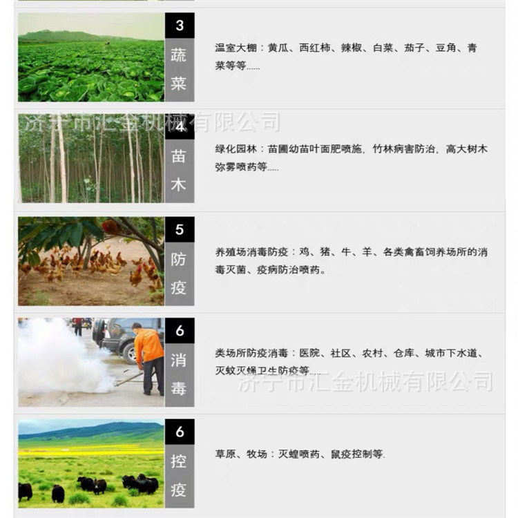- Applicable objects: tea trees, vegetables, lawns, fruit trees, disinfection and epidemic prevention, roadside hedges