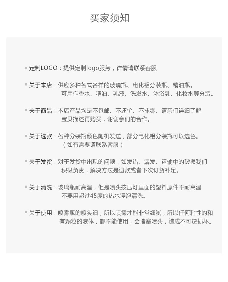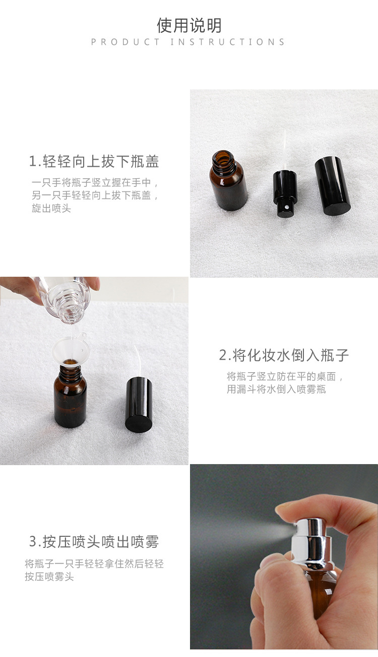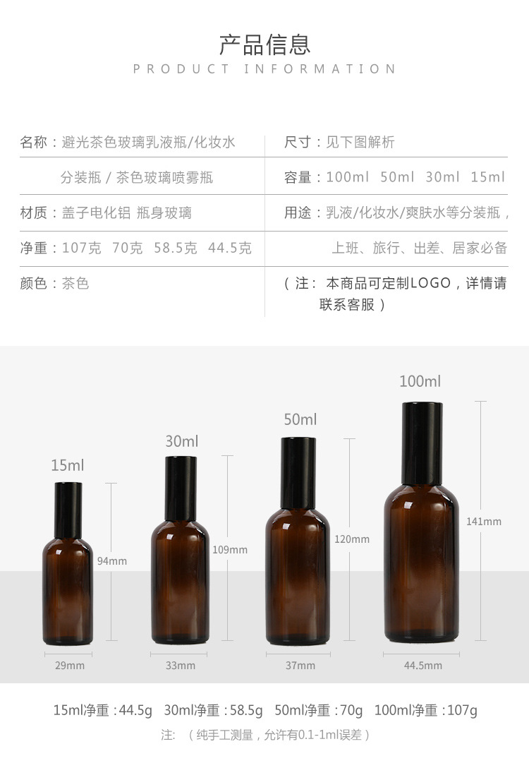 - Capacity: 15ml lotion bottle, 30ml lotion bottle, 50ml lotion bottle, 100ml lotion bottle, 15ml spray bottle, 30ml spray bottle, 50ml spray bottle, 100ml spray bottle