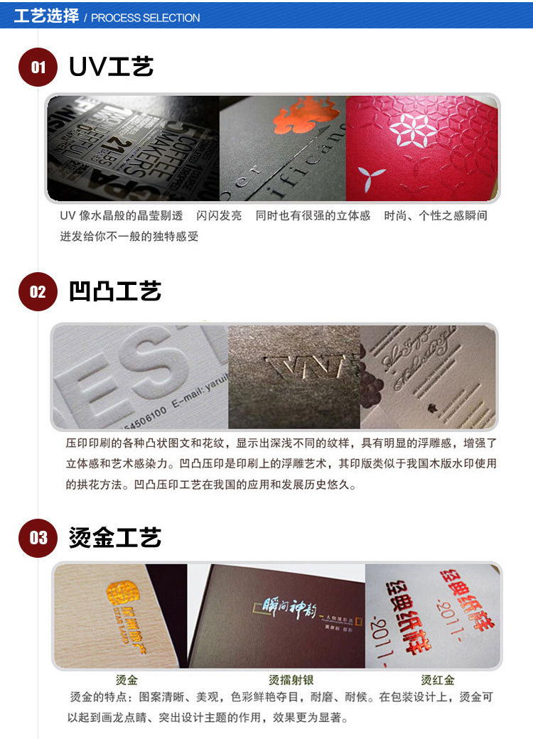 - Process: Screen printing, embossing, offset printing, bronzing (hot silver), UV printing, gravure
