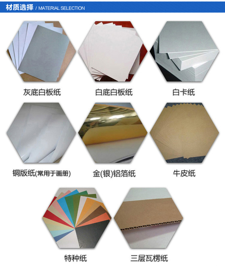 - paper (board) material: coated paper, white cardboard, white paper, kraft paper, black cardboard