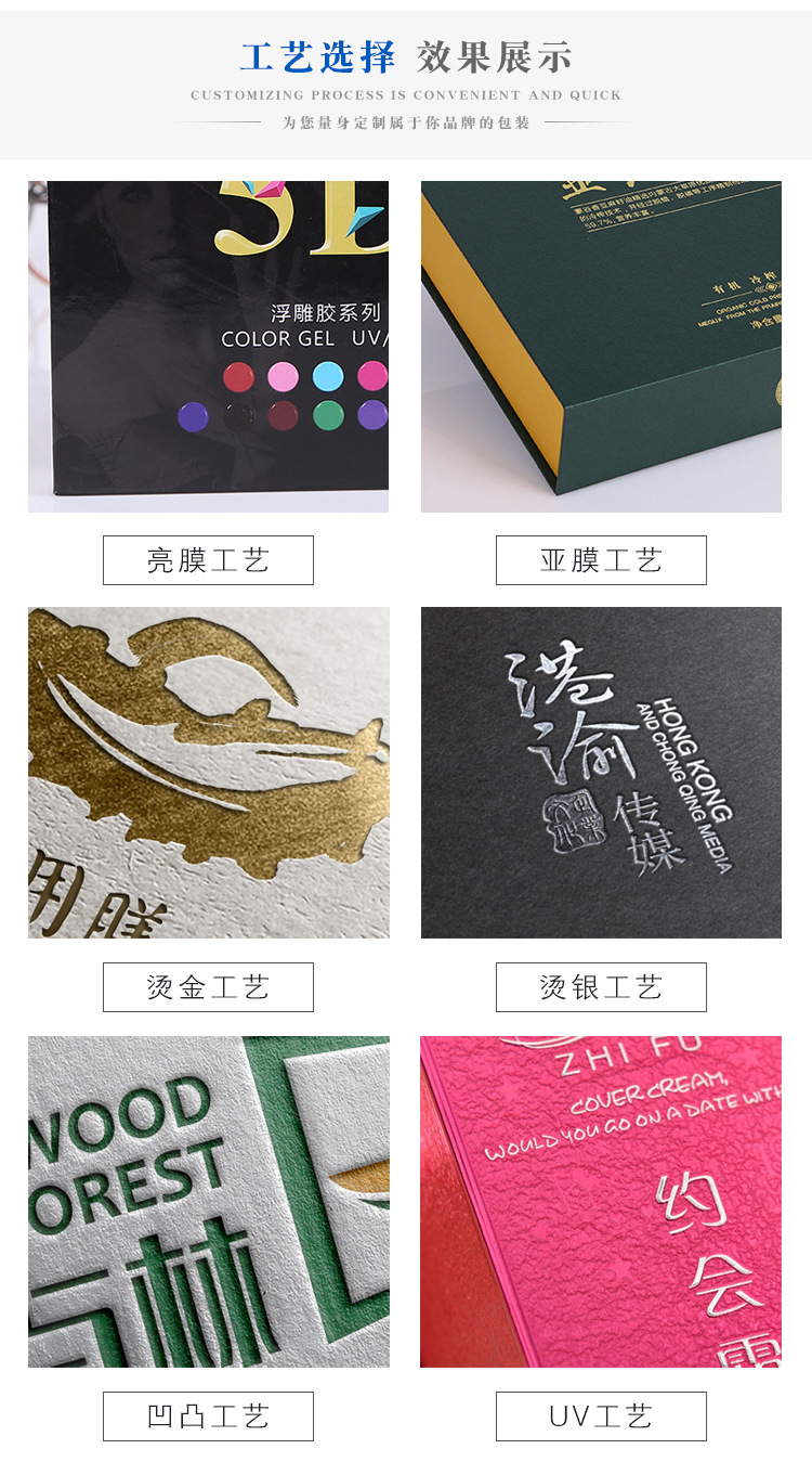 - Process: Screen printing, embossing, offset printing, flocking, hot stamping (hot silver), UV printing, gravure